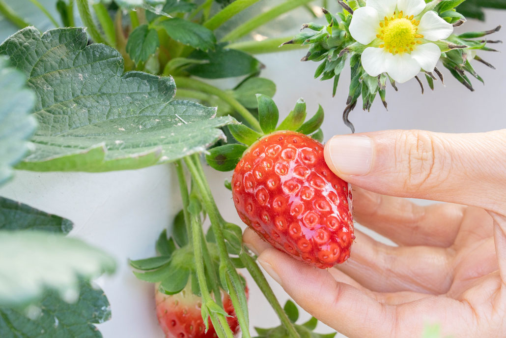 (お花まで可愛らしいなんて…苺ってパーフェクトな可愛さですね!)