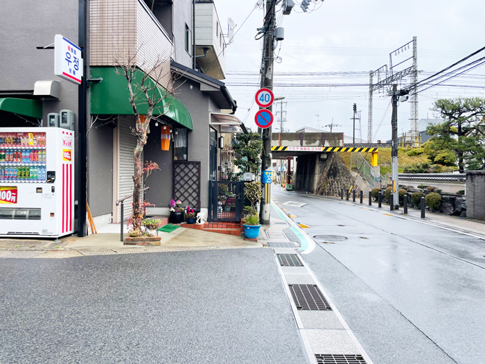 東へ進むと近鉄京都線の高架橋などが、西へ進むと手づくりパン工房「aLzo」などがあります。