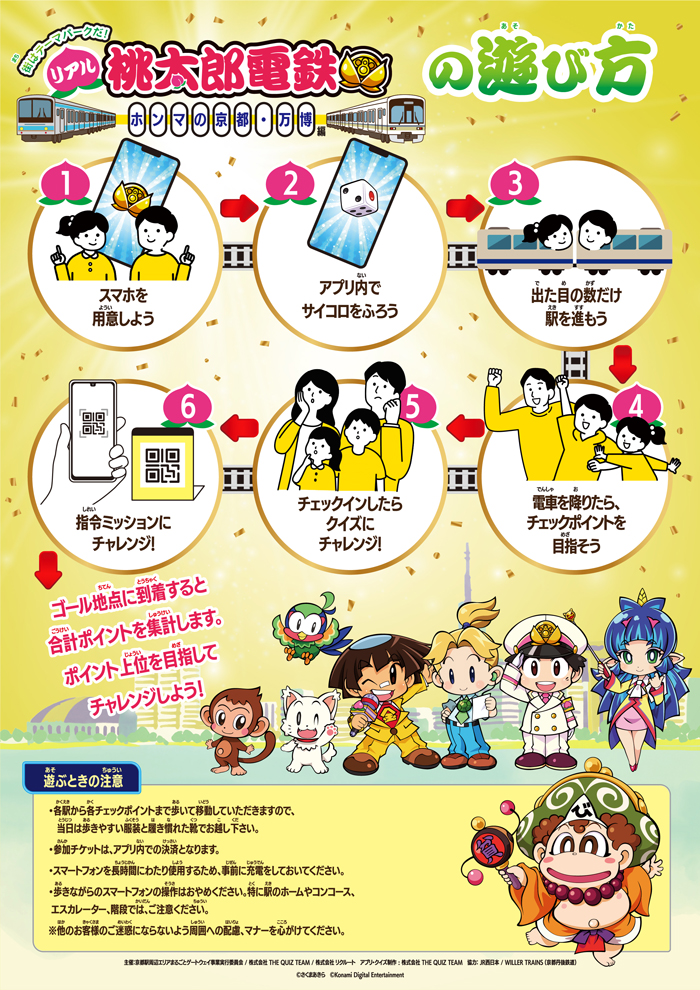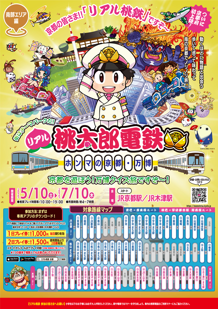 そして「街はテーマパークだ!リアル桃太郎電鉄~ホンマの京都・万博編 京都を遊ぼう!万博クイズ旅ですぞ~!」と銘打ち開催される今回のリアル桃鉄は、第一弾は5月10日(土)~7月10日(木)に京都南部エリア、第二弾は7月1日(火)~8月31日(日)に京都北部エリアを舞台として開催されます。