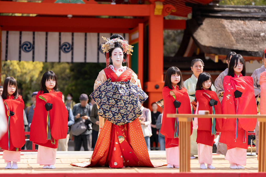 華やかな衣装に身を包んだ葵太夫が禿(かむろ)や傘持ちなどを従えて、「内八文字」と呼ばれる歩き方で参道を練り歩く「島原太夫道中」。